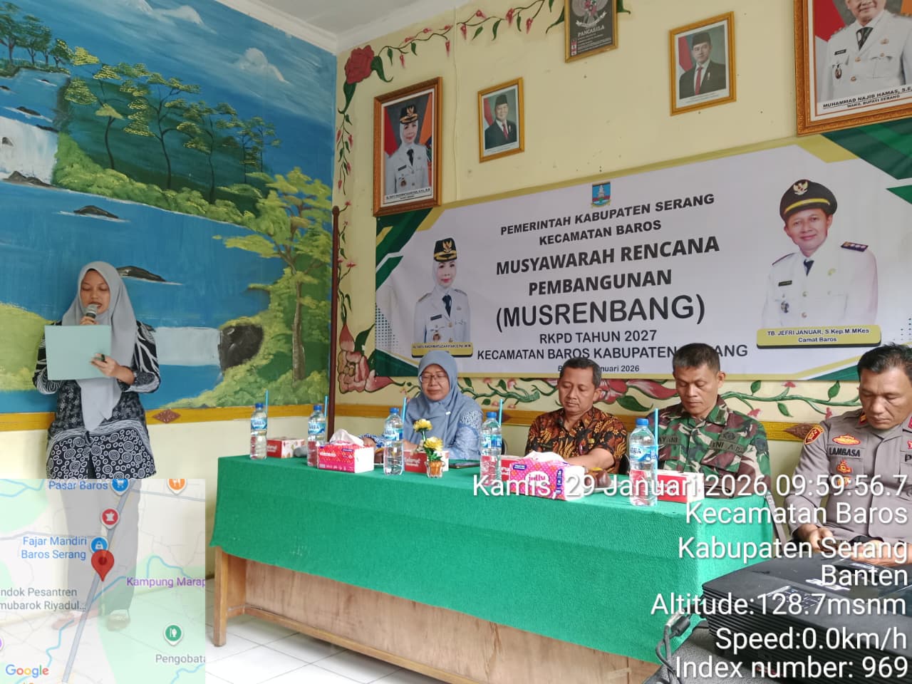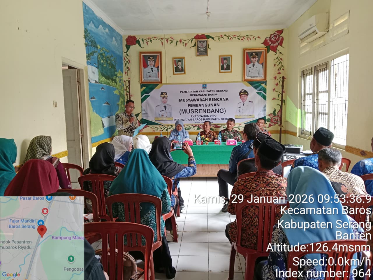 Pelaksanaan Musrenbang Kecamatan di laksakan pada hari kamis 29 januari 2026 bertempat di aula kecamatan baros, musrenbang kecamatan baros yang di hadiri oleh ibu BAPEREDA Kabupaten serang, danramil, kapolsek Baros serta bapak kepaladesa dan perangkat desa sekecamatan baros, BPD kecamatan baros, Kepala Sekolah se kecamatan baros dan seluruh UPT puskesmas, pertanian Balai KB dan Pengairan,