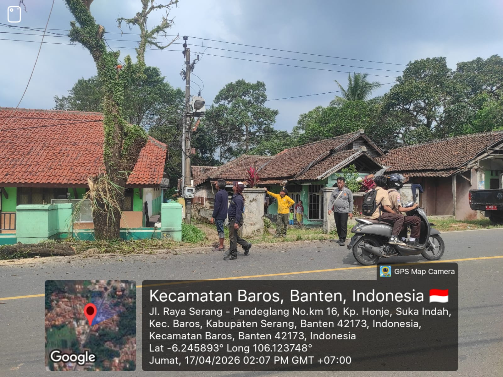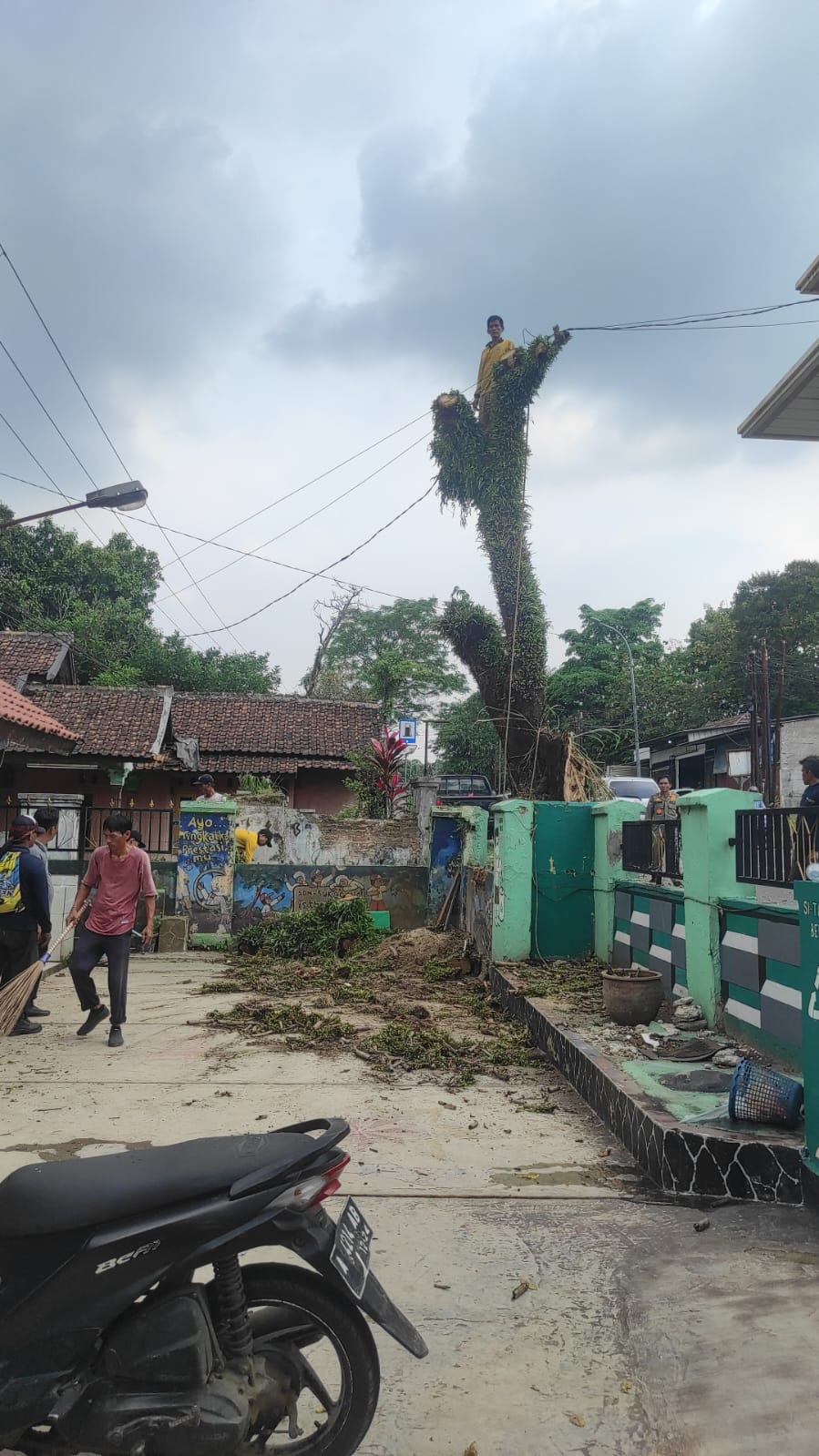 Berita Persiapan penebangan pohon di depan UPT SDN sukacai 1 Kecamatan Baros Kabupaten Serang