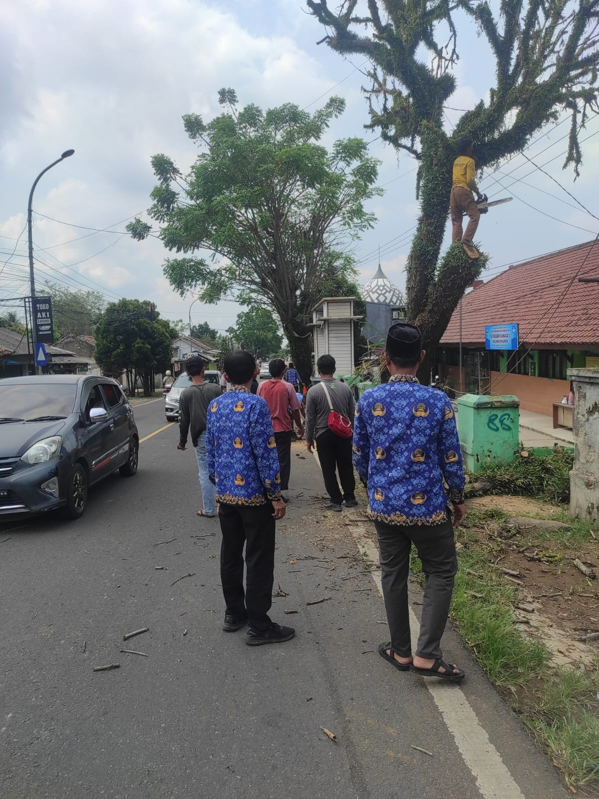 Persiapan penebangan pohon di depan UPT SDN sukacai 1 Kecamatan Baros Kabupaten Serang